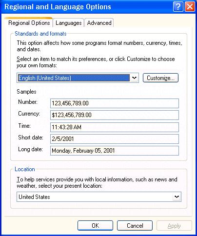 Windows XP Regional & Language Options control panel