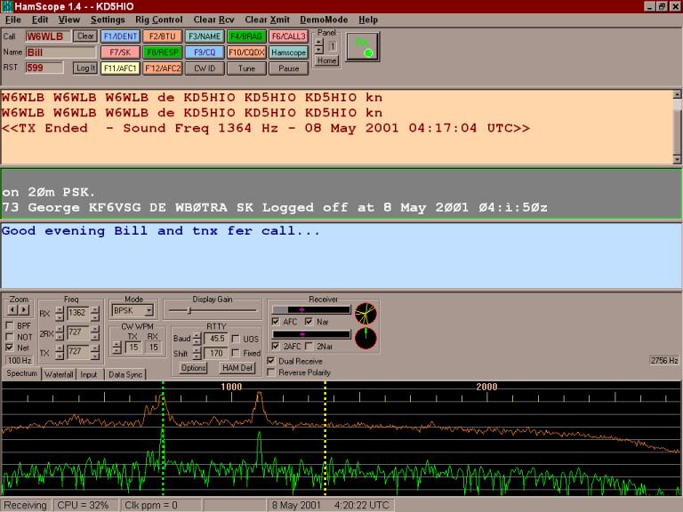 | I use the MMTTY software for RTTY, which interfaces to Hamscope for RTTY functions. I really like the X-Y scope and automatic tuning functions this software provides. And, I use the MMSSTV software for Slow Scan TV. Both are written by JE3HHT, Mako. All of his software is offered for free. Here are screenshots. |